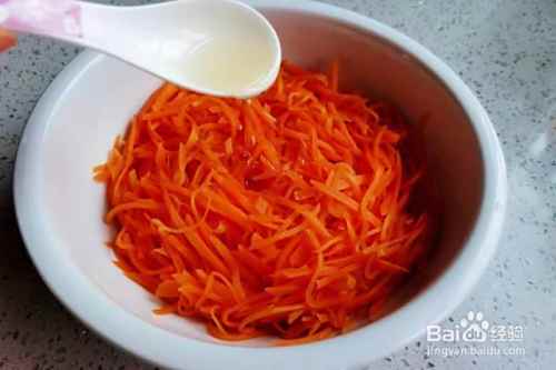 将胡萝卜丝放入空盆中,加入一勺蜂蜜,充分搅拌均匀,备用。