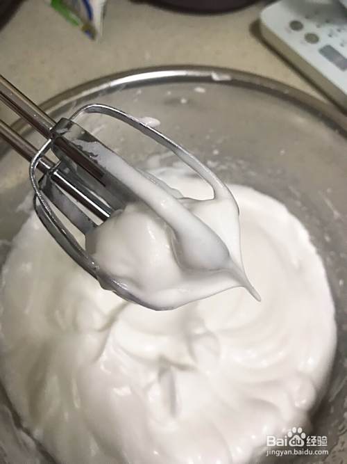 第④打:再加15克糖,高档位打至打蛋器拉起来能拉出尖角,用手指kuai一点放嘴里,像奶油呢~