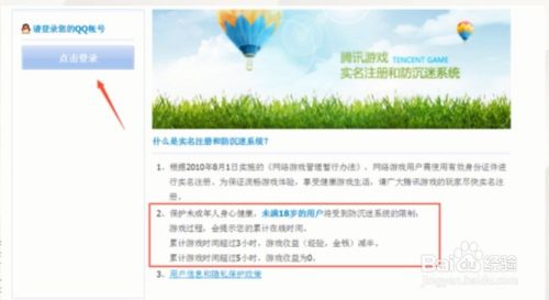 然后,大家就可以看到最下方,腾讯游戏官方对防沉迷做的解说,(大家可以进行一下简单的阅读,看看它的要求是否适用自己。)然后就可以点击左侧的点击登录,进入下一步。