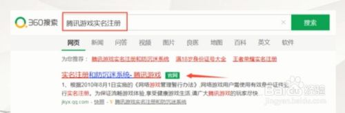首先,我们先打开360浏览器,并且在输入框中输入我们的关键字,腾讯游戏实名注册,点击官网链接进入。(记住这里一定要是官网才可以奥,所以一定要记住看到标有官网的小图标再点进去。)