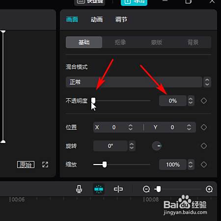然后,在基础设置面板这里,找到“不透明度”;当前的不透明度数值是100的。把它调节为0