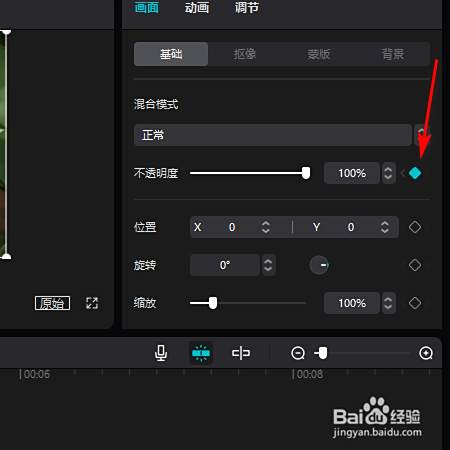 然后,回到设置不透明度这里,把不透明度数值设置为100;这时候,不用再点关键帧的小按钮,软件自动打上关键帧。小按钮呈现蓝色状态。