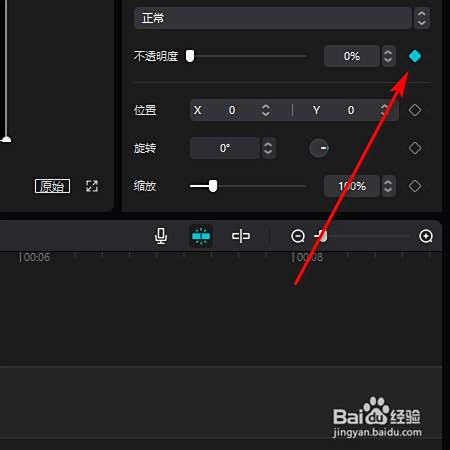 再看右侧,如下图箭头所指,这个小按钮就是添加关键帧的按钮。点击它,它就变成蓝色状态,表示在图片开始位置打上了关键帧