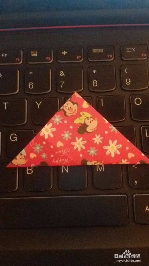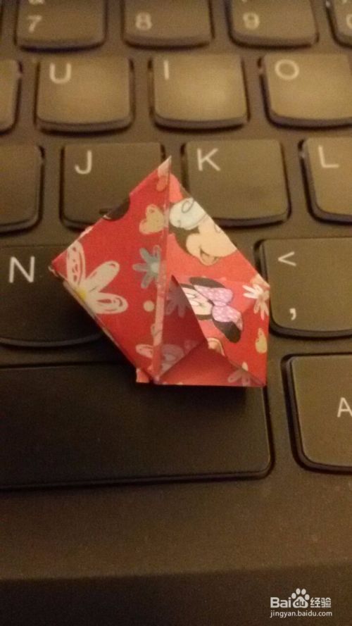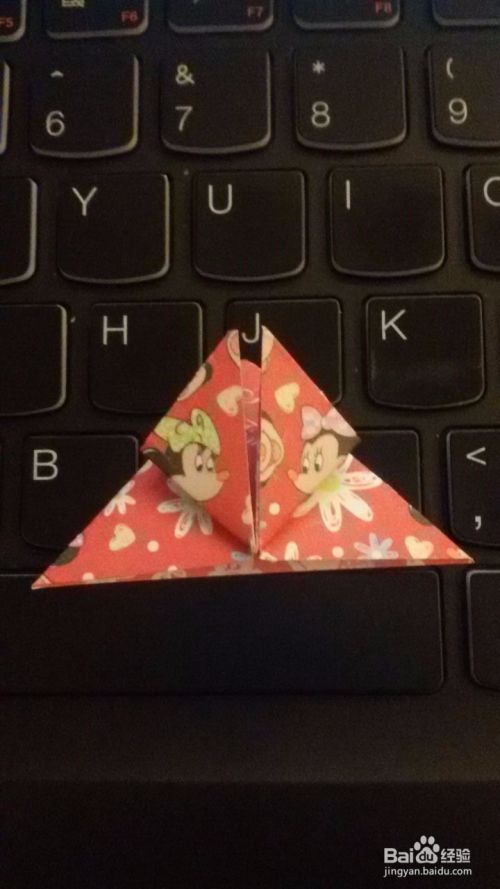 沿中线撕开一小截,翻回刚才的一面,这时会看到中线的裂缝,如图所示,折成四个小三角形,然后将上面的顶点翻下来。背面重复同样的步骤。