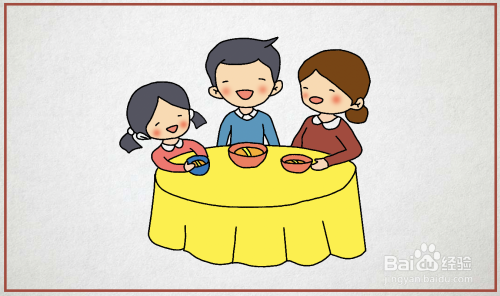 最后就是涂上好看的颜色,画一个装饰框,这样一家人吃团圆饭就画好了;