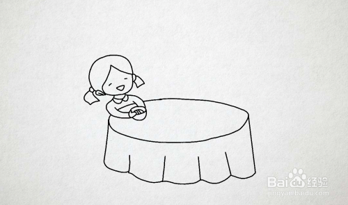 接着画出绑着辫子的小女孩在开心吃面的样子;