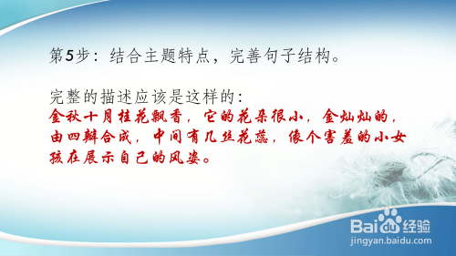 描述句不是评论性质的,而是单纯的描写。注意突出细节,刻画主题,形容生动。