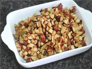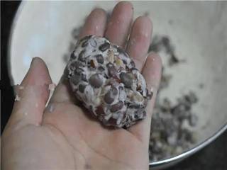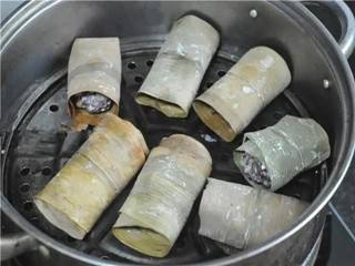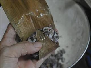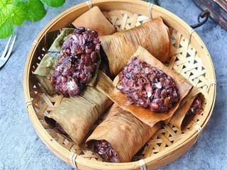 红枣清洗干净,去核,切成小丁,红枣和红豆混合,搅拌均匀,加入糯米粉,搅拌均匀,分成35g/个,捏成椭圆形,放在粽叶上,裹起,放入蒸锅中,蒸熟。