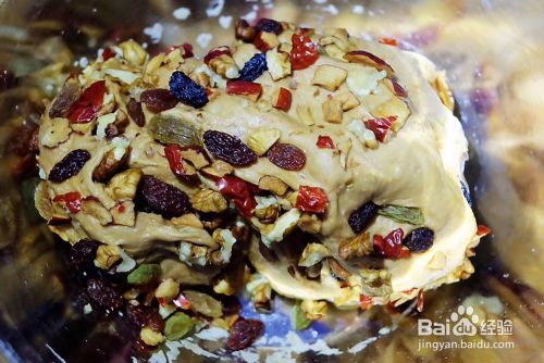 面团发酵好后取出排气,揉面,倒入红枣核桃葡萄干,继续揉面,混匀,这时不用太用力揉,以免葡萄干核桃丁揉烂。