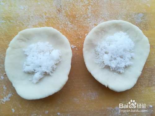 再用面皮把白糖包住,用手掌压成面饼形状,制成面饼生坯。
