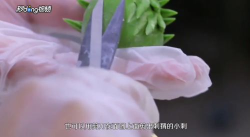 5可以用刀在面团上划出南瓜的纹路,也可以用剪刀在面团上面剪出刺猬的小刺。