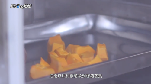 1南瓜切成块,把南瓜块和紫薯放到烤箱蒸熟。