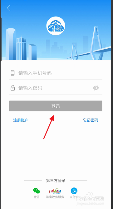进入椰城市民云APP,选择输入相关登录账户信息,进行账号的登录