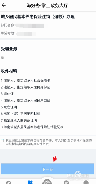 进入城乡居民基本养老保险注销(退款)办理查看相关信息,点击下方的下一步申请办理