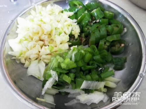 5蒜子剁成蒜蓉、香葱切粒、尖椒切粒
