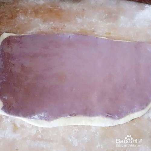 将擀好的紫薯面片放到小麦面片上,上面抹一层食用油。