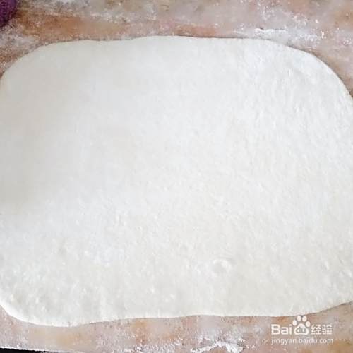 小麦粉发酵至原面团1倍大时,面团就发酵好了,揉面5分钟,擀成片。