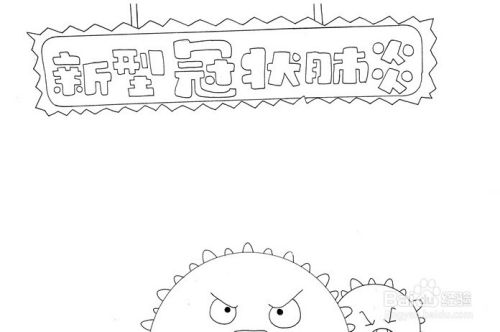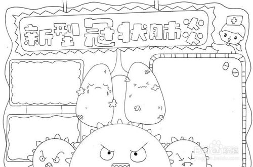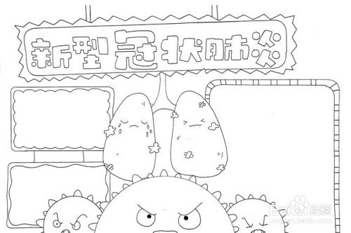 首先在上方画上报头文字“新型冠状肺炎”,加上矩形边框,外面再画上一层锯齿形状,再在底部的中间那位置画上半个圆形的边框,周围画上一些小的半个椭圆形,再画出大眼睛和嘴巴。