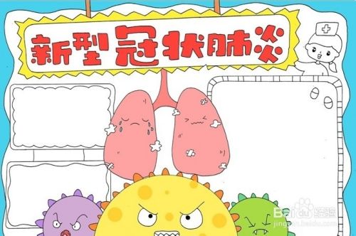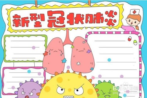 先在上方画上报头,中间画上三个病毒和一个肺,并给它们加上合适的表情,然后画出背景边框和里面的三个小边框,右上角画上人物,补充其它细节之处,接下来涂上合适的颜色,最后画上文字栏,简单的手抄报就画好了。