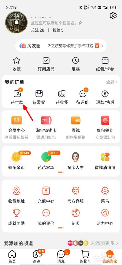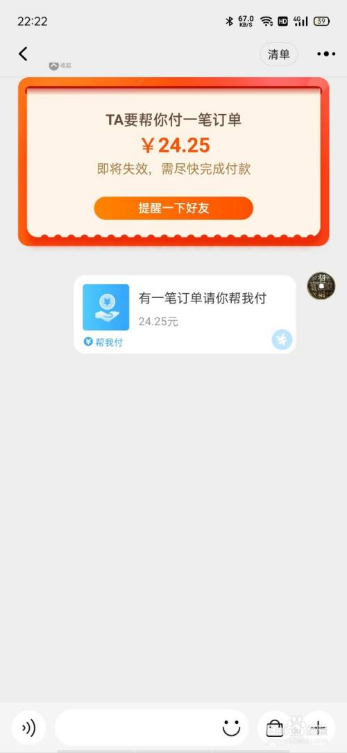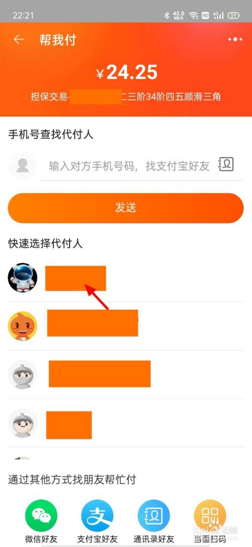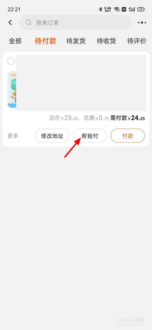 打开淘宝,选择商品提交订单,在付款页面关闭付款页。在未付款订单选择帮我付,选择好友,朋友就可以帮忙代付。