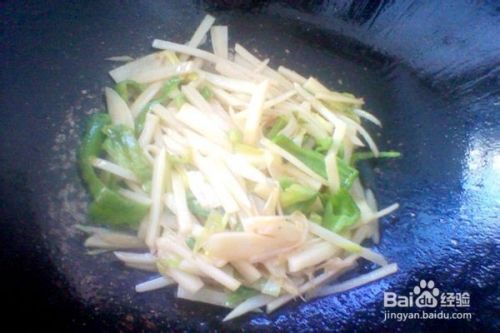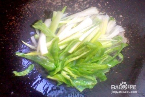在锅中的油烧到六成热的时候,把盘中准备好的蒜苗和青椒丝倒入锅中,翻炒几下。