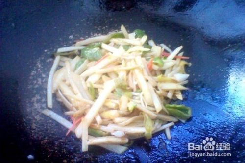 把土豆丝平铺在锅底炕一会儿,然后再翻炒几下,