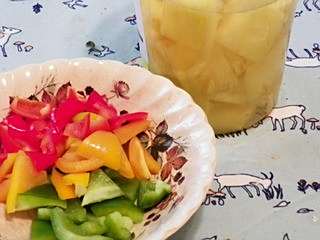 重新起锅,放少许姜丝和蒜头,爆香后下菜椒,稍翻炒,点入精盐,兜至七八成熟,倒入菠萝