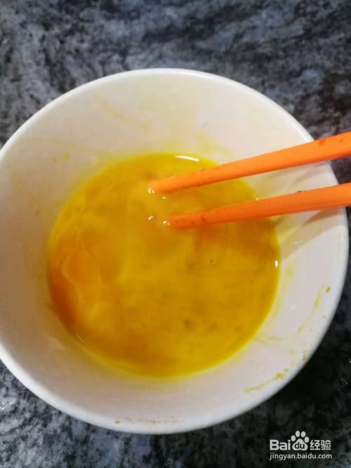 四个土鸡蛋打散,加入些许盐、胡椒粉调味