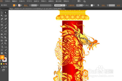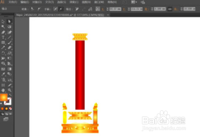 5、柱子上面的龙形图案使用橙黄色到橙红色的渐变填充,再用暗红色对于柱子进行描边。