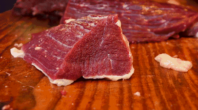 购买牛肉请观察肉品颜色,一般正常的牛肉颜色呈暗(深)红色,而经过注水的牛肉由于细胞破裂,颜色会变得“淡白”,红色肉体和白色脂肪分界不明显。