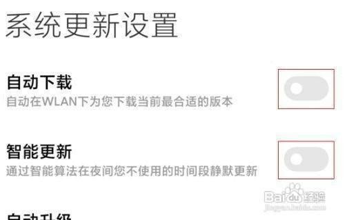 在系统更新设置界面,最后将自动下载和智能更新选项的开关关闭即可。