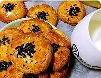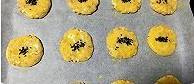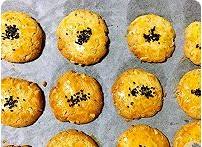 将面团分成25g大小的小面团,撮圆,在烤盘上压扁,表面刷上蛋黄液,撒上少许黑芝麻。烤箱预热至180°。