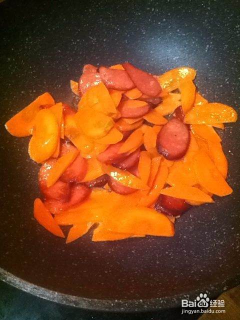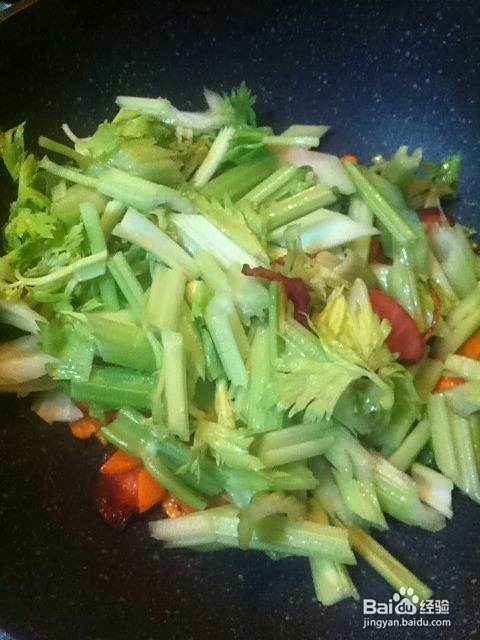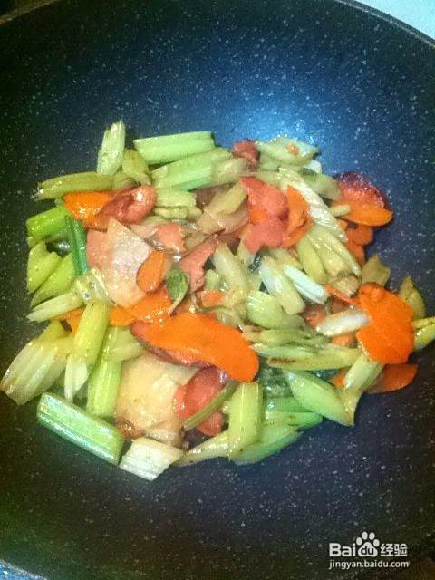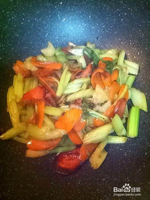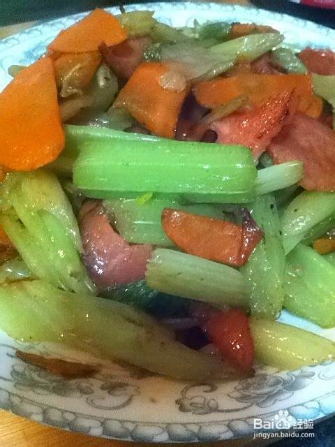 芹菜胡萝卜炒香肠是一道家常菜,芹菜中含有丰富的纤维素,有助于肠胃蠕动,但芹菜是感光蔬菜,要适量吃哦