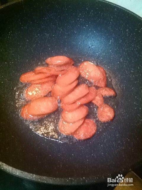 锅烧热,加入适量油,油热后放入香肠翻炒