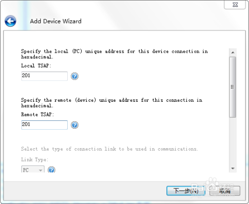 点击 click to add a device -》写入设备名称 -》设备Mode 选择 S7-200 -》填入PLC设备IP地址-》一直点击默认 -》直到如下图 -》Local TSAP:201 -》Remote TSAP :201-》选择Big Endian -》点击完成