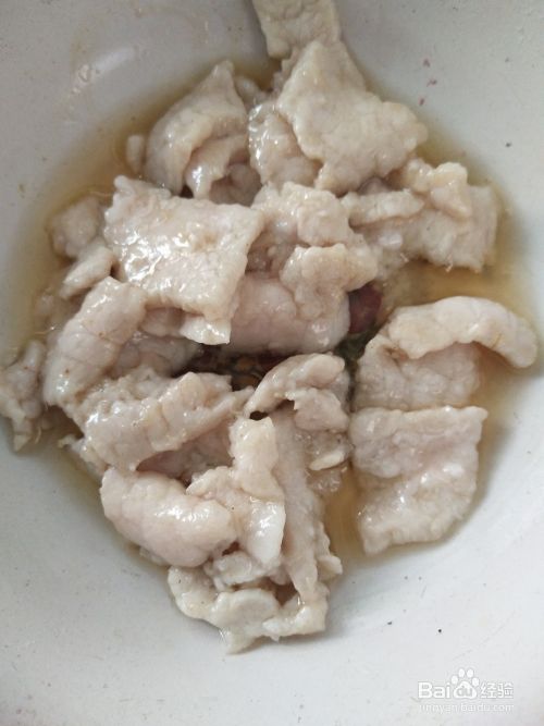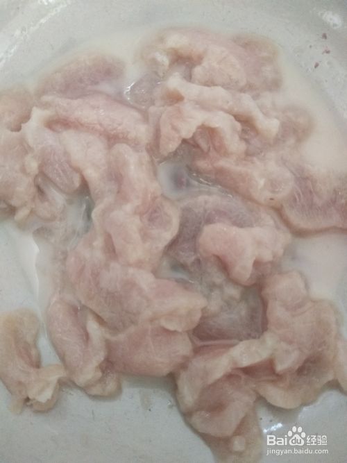 瘦肉60克。切成片儿,用淀粉浆制。锅里放油,加热。待油温升至七成热时,放入浆制好的肉,滑出。待用。