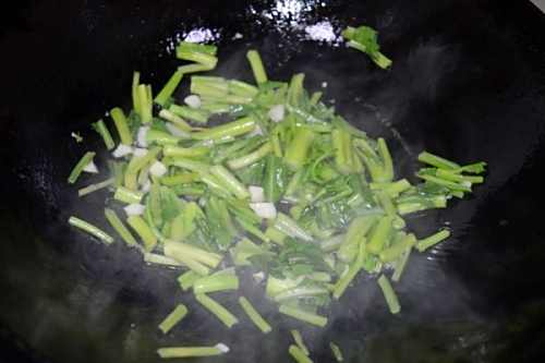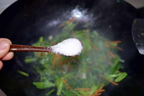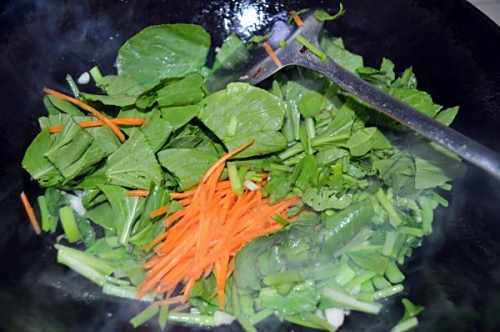 6再加入青菜叶,胡萝卜丝翻炒片刻;