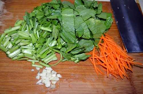3将青菜洗净切段、胡萝卜切丝、大蒜切末;
