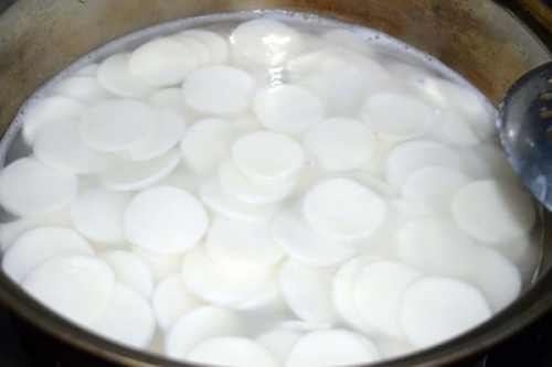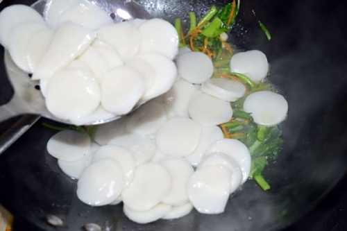 1提前将年糕切片,锅中注入水,烧开后,将切好的年糕倒入,煮三分钟捞出沥干;