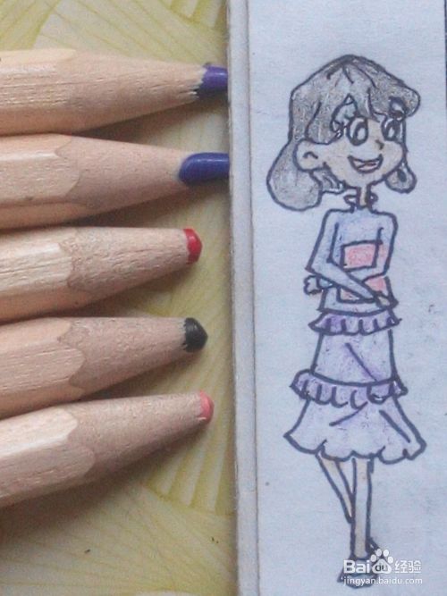 用红色彩铅,肉色彩铅,深蓝色彩铅,深紫色彩铅为女教师涂上颜色。