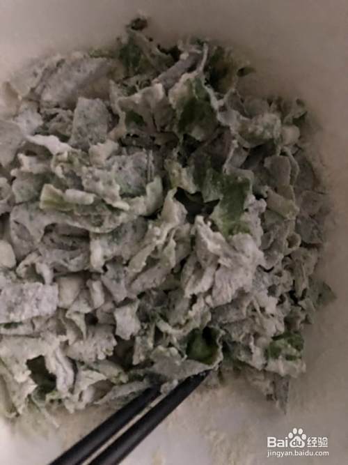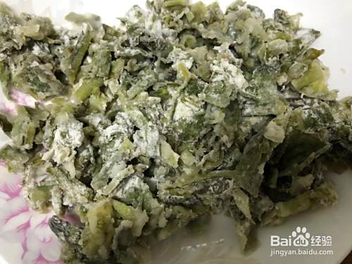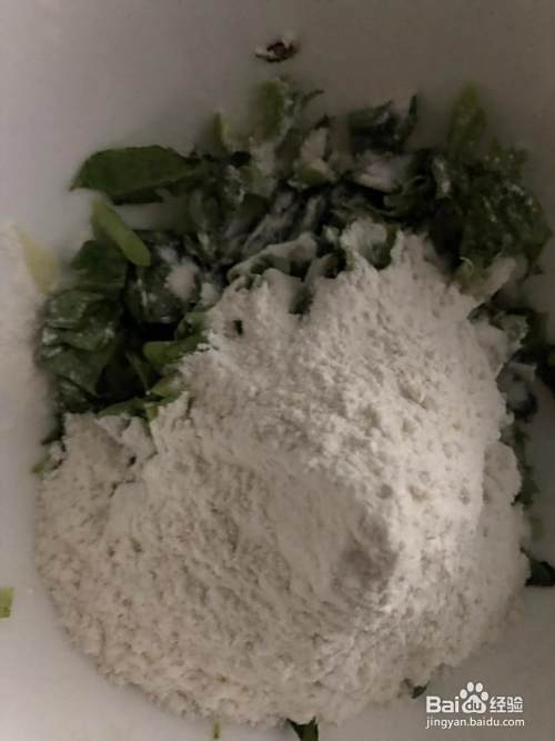 将切好的莴苣叶放入大碗中,倒入面粉,将莴苣叶和面粉混合均匀。