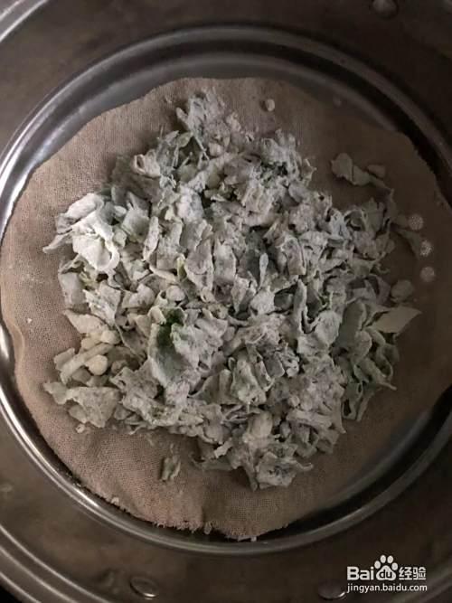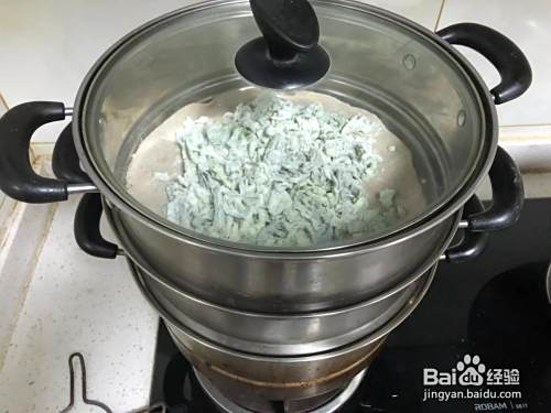 将裹上面粉的莴苣叶放入蒸锅中,蒸上八分钟。