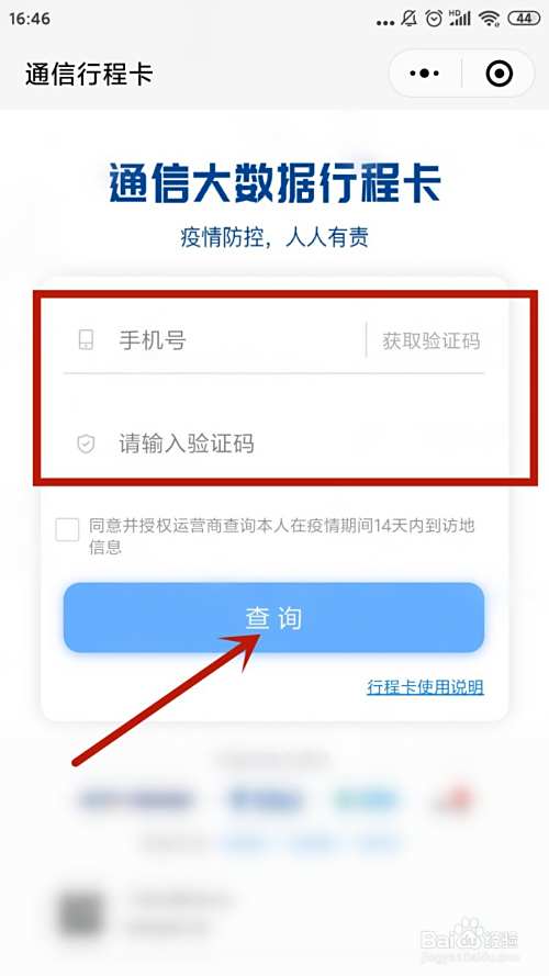 在通信行程卡界面输入手机号,获取验证码之后输入,勾选相关选项,再点击查询即可获取行程码。