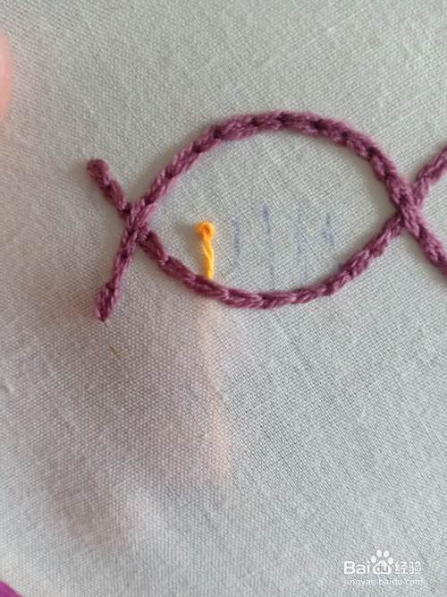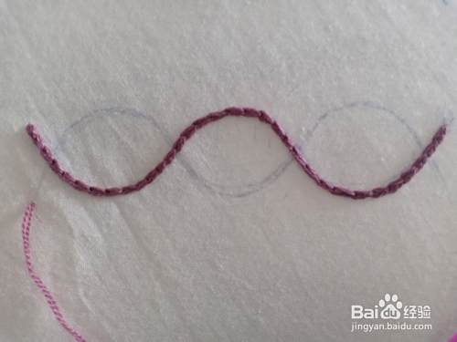 我们把第一条辅助线绣好之后,接下来,开始绣另外一条辅助线。绣法都是一样的,只有绣到阻碍的时,直接以锁链绣的方式,把它绣到里面就可以了。