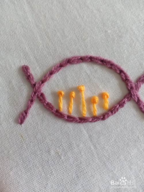 接着,我们换线,绣制里面的直线花样。直线花样的绣法,以前也分享过。就是从一端出针,然后在针上绕 2 圈线,在直线的另一端入针,绣一个“带有尾巴的,法国结粒绣。”