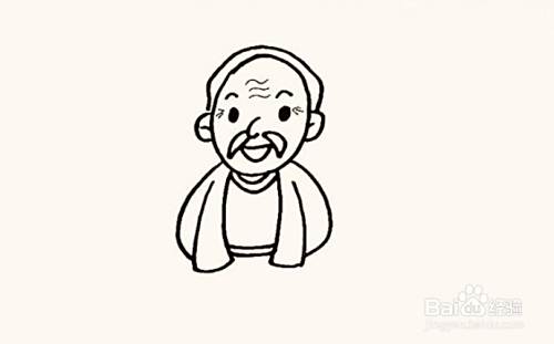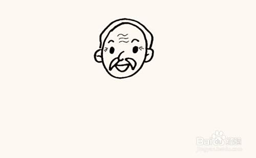 第二步,再画出爷爷的眉毛、眼睛、鼻子和嘴巴,在嘴巴两侧再画出爷爷的两撇胡子。