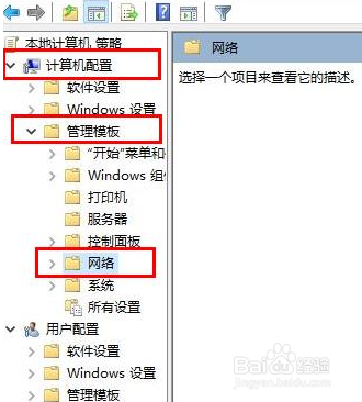2、在左侧任务栏中选择“计算机配置—》“管理模板”—》“网络”。