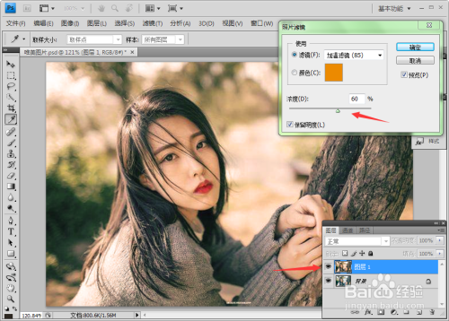 选择图层1,为图层1添加照片滤镜效果,将浓度设置为60%左右。当然,这个值到底设置多少,要根据照片的实际情况而定。