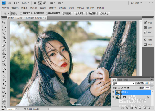 启动photoshop软件,打开一张生活照,复制背景图层,得到和背景图层一样的图层1。