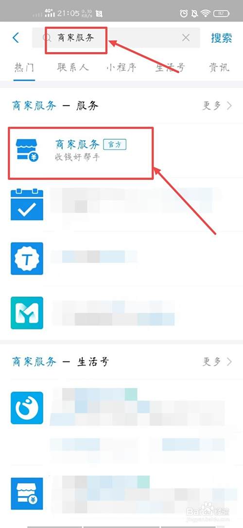 打开“支付宝”,搜索“商家服务”,点击“商家服务”